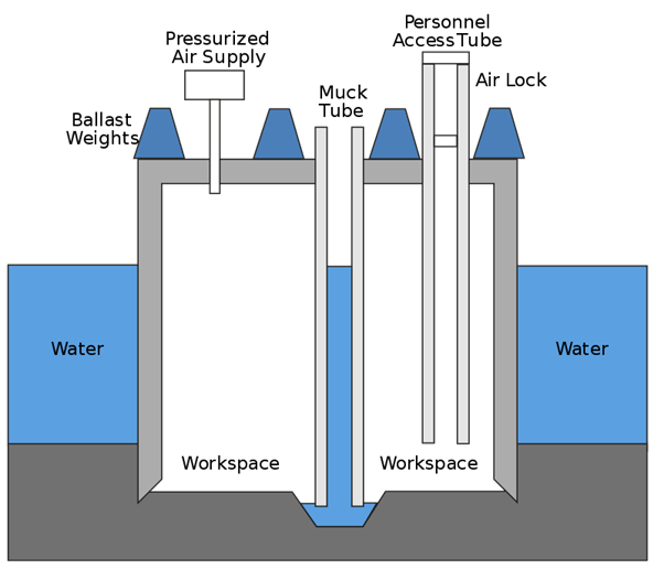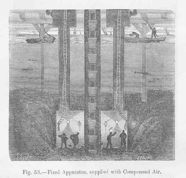 This was dangerous work. A failure with the compressed air would mean the workmen drown. And compressed air risked serious health problems when returning to the surface.